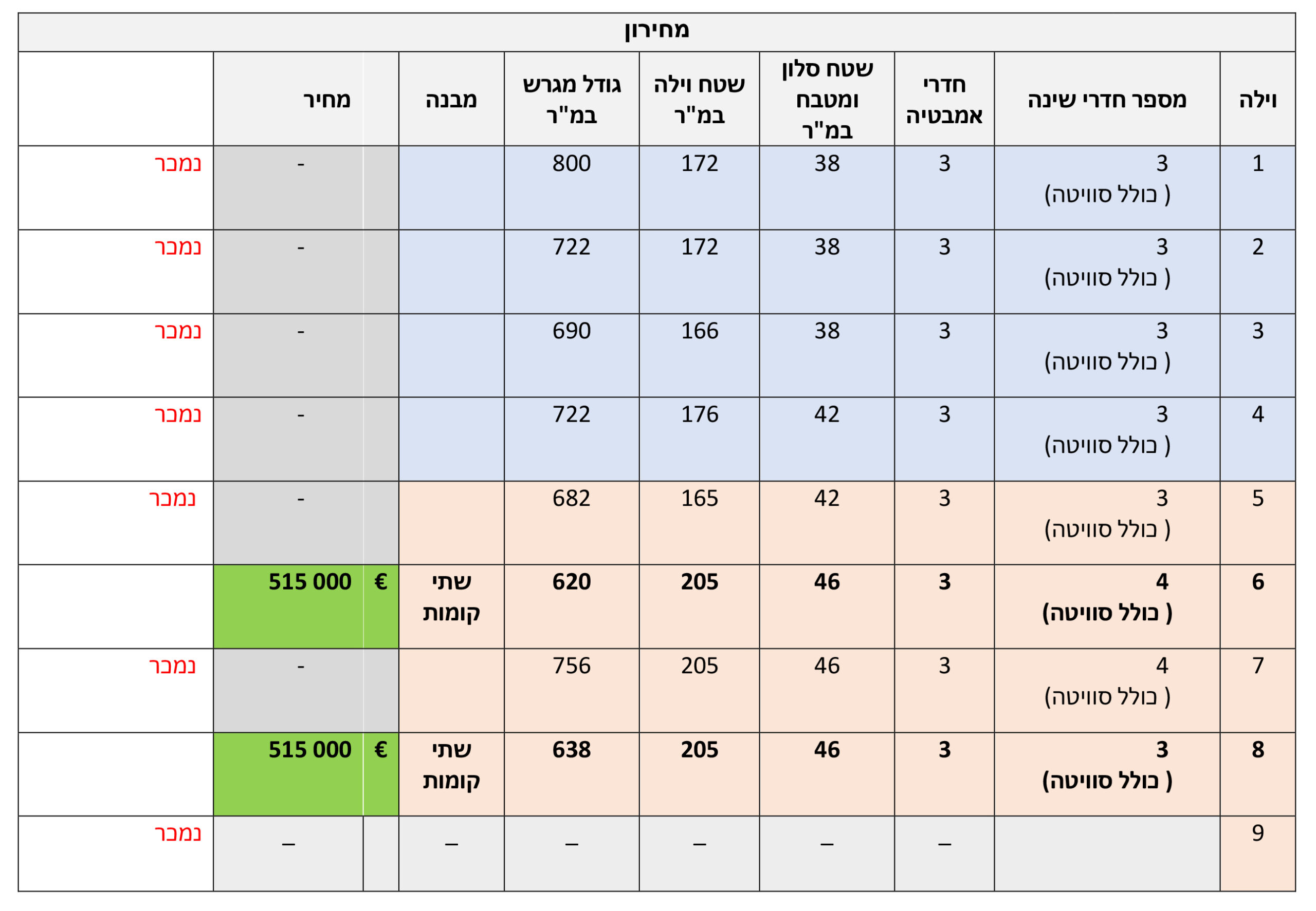 הפרויקט המשותף מורכב מ-9 וילות צמודות, בשטחים שנעים בין 165 ל- 205 מ"ר, שתוכננו לעמוד בסטנדרטים הגבוהים ביותר, המשלבים עיצוב פנים מתוחכם עם גימורים איכותיים. הוילות פונות לכיוון דרום. לכל וילה יש בריכה פרטית.